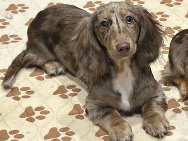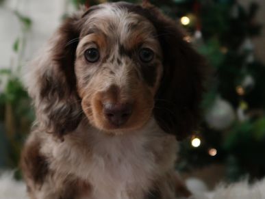 Valerie is a black and cream dapple, long hair. She carry's chocolate. She is currently 7 months old, she is a small girl, she has a short stature and long body, gorgeous long ears and her coat is starting to come in nicely.